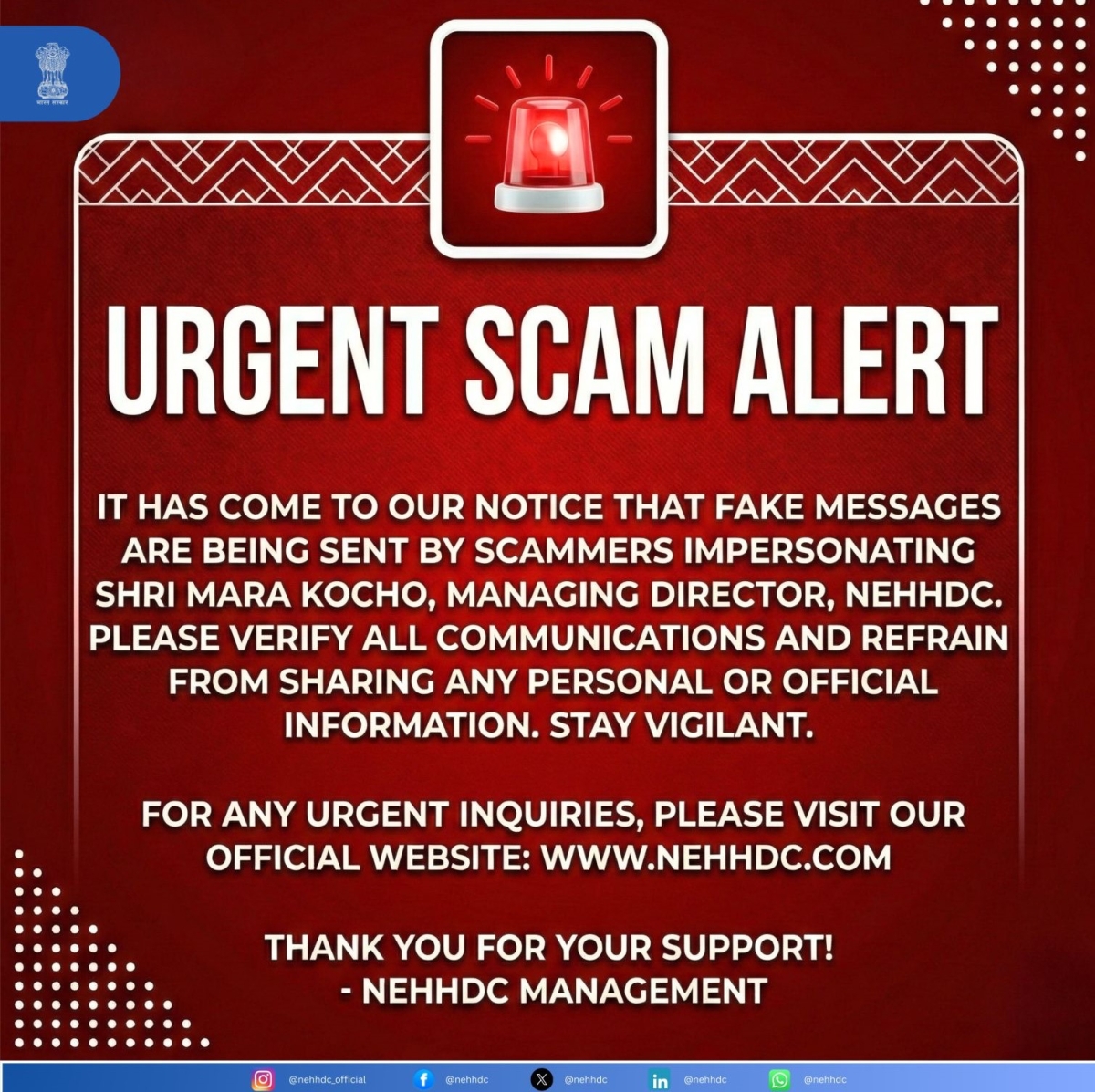 It has been brought to our attention that scammers are currently sending fake messages impersonating Shri Mara Kocho, Managing Director, NEHHDC and other NEHHDC officials.